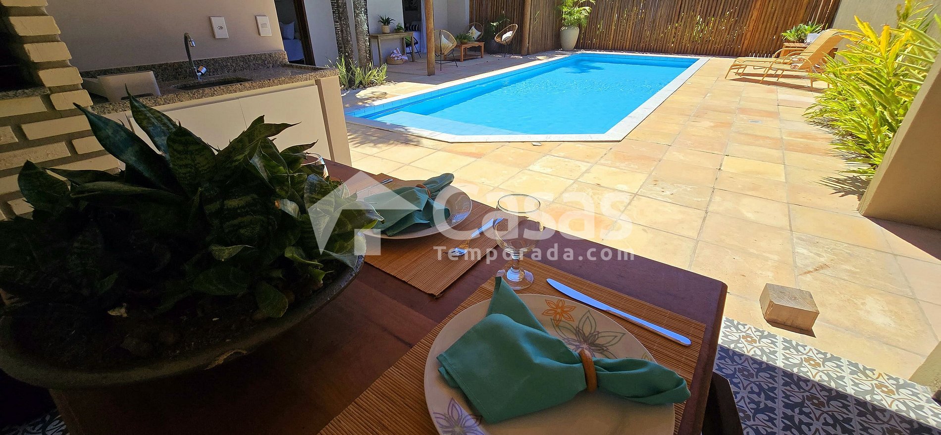 Los dormitorios tienen vista directa a la piscina, separados por una encantadora galería rústica, creando un ambiente cálido y encantador. La cocina exterior permite preparar ricas comidas sin perder el contacto con amigos o familiares.