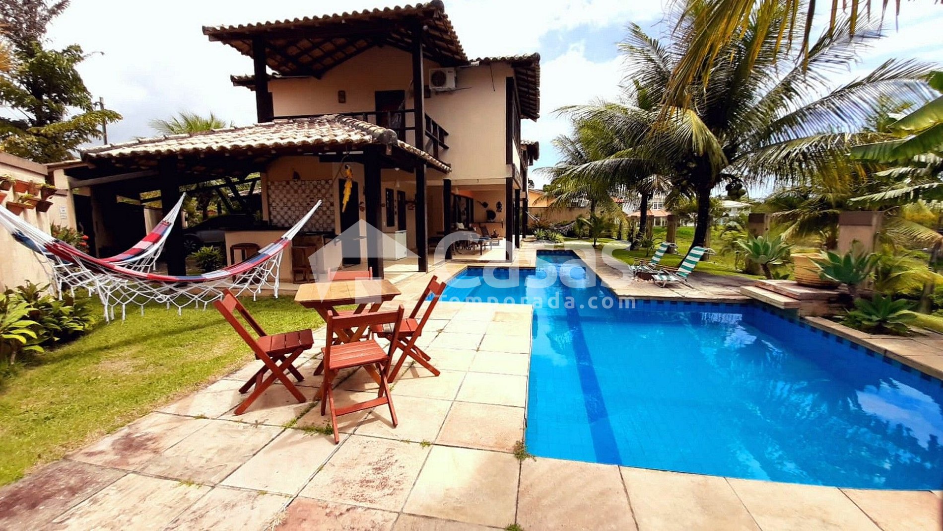 Área de Lazer Completa para viver momentos inesquecíveis na piscina privativa com cascata e lado raso, ideal para crianças. O espaço conta com churrasqueira redário para descanso e um jardim amplo com árvores de coco, onde você pode colher direto do pé.