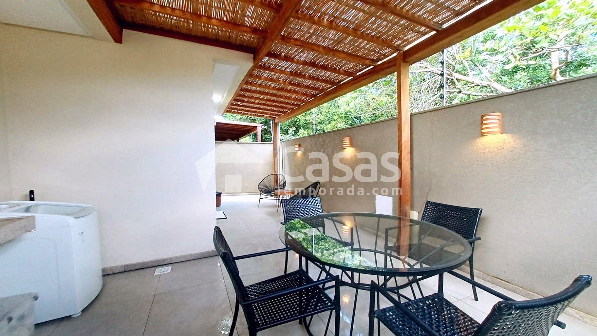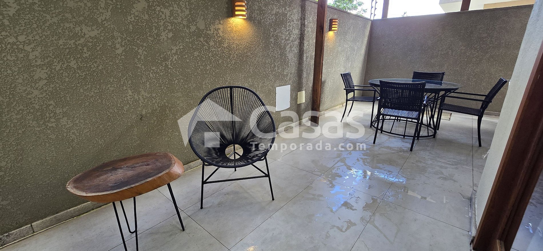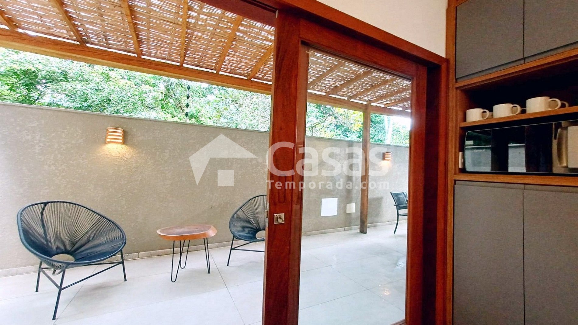Varanda térrea aconchegante, perfeita para relaxar após um dia de praia