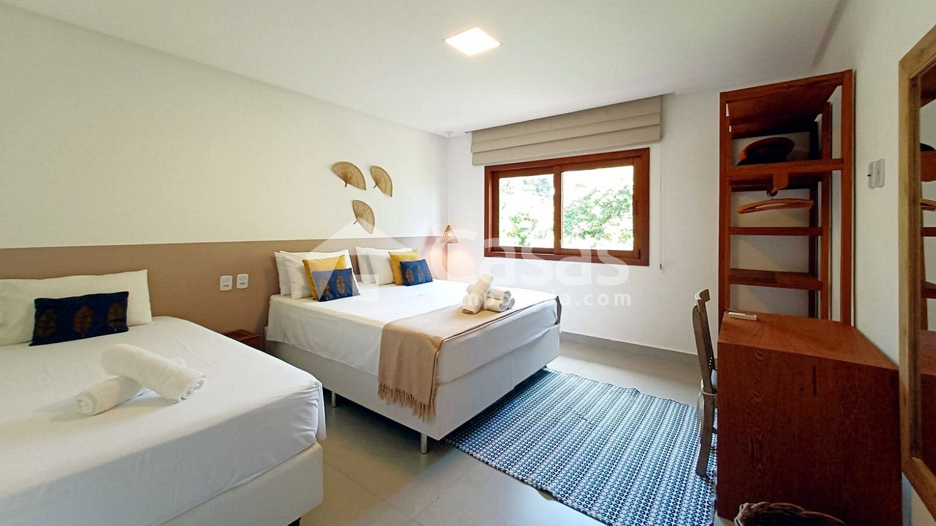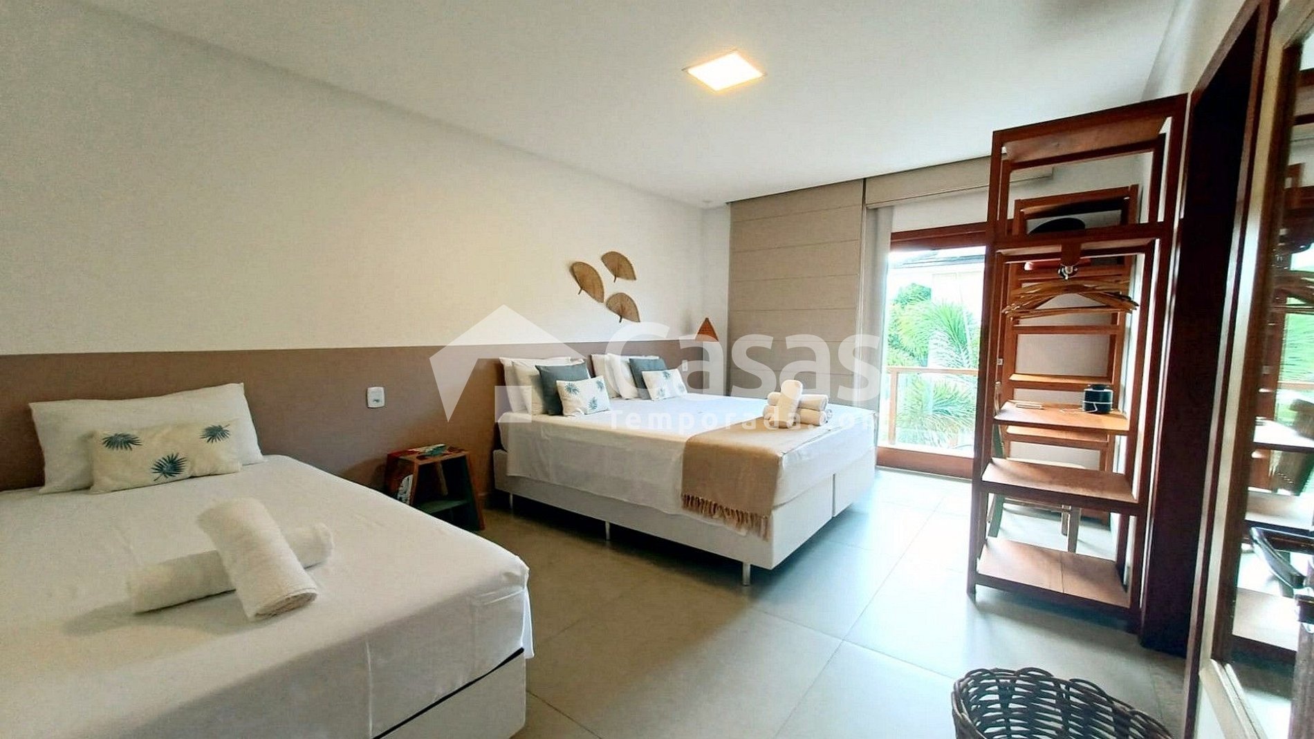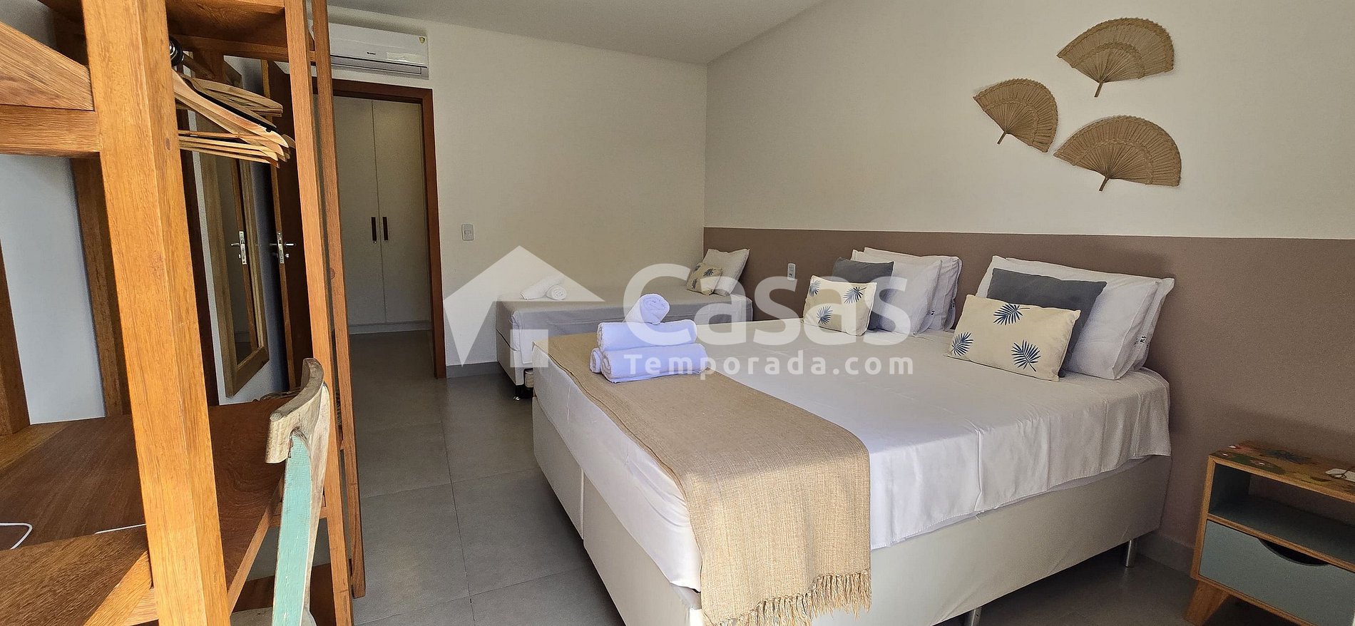 Cada suíte conta com duas camas de casal e uma de solteiro, além de armários com cabides e espelhos