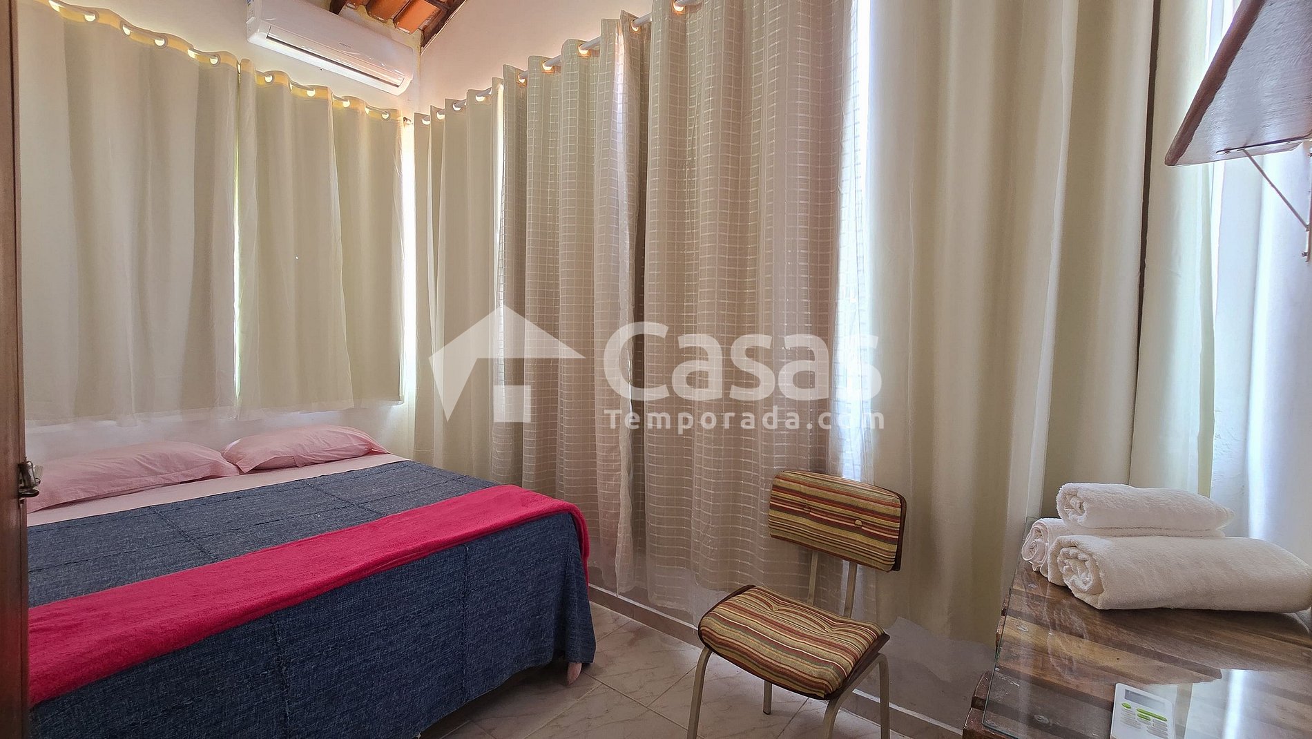 Todos os quartos com ar condicionado bem potente, casa muito aconchegante, todos ficaram muito bem acomodados Éramos em 10 adultos e 3 crianças