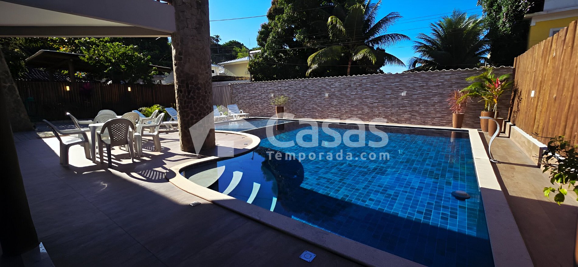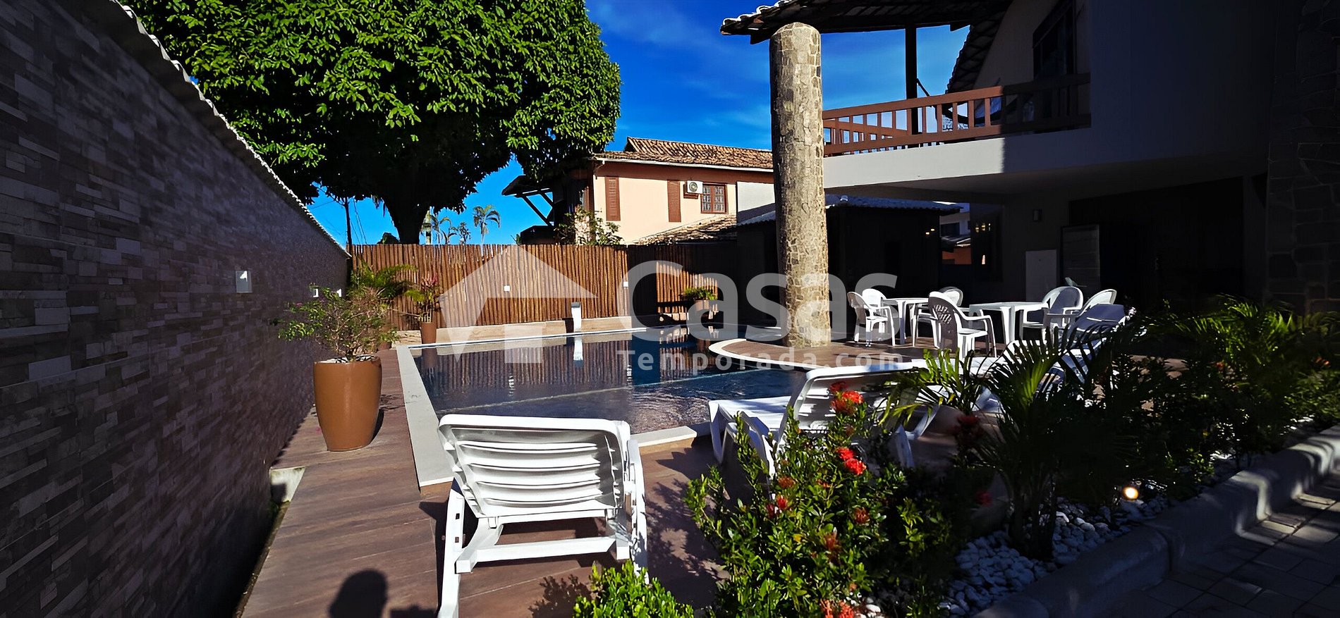Desperte com o som dos pássaros a poucos metros do mar, mergulhe em sua piscina privativa e celebre momentos únicos com amigos e família. Na Casa Brito’s House, conforto e amplitude se unem para proporcionar uma experiência memorável em Porto Seguro. Nosso espaço recebe confortavelmente até 36 pessoas, e o valor da estadia é calculado por pessoa.